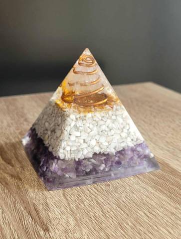 J’aime particulièrement cette orgonite pour l’harmonie subtile qu’elle diffuse. L’améthyste élève l’énergie et favorise la clarté mentale, tandis que la howlite apporte un apaisement profond, aidant à relâcher les tensions mentales et émotionnelles.